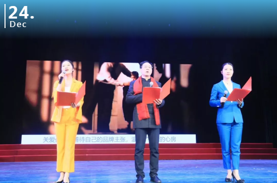 寧鄉大劇院劇場內企業風采展示節目現場,湖南東方時裝有限公司以一首大氣磅礴的《自在之路》詩歌朗誦獲得大家的一致好評,掌聲如潮。身著圣澳威斯定制職業裝的朗讀者以時尚、精致、干練的姿態展示出圣澳威斯團隊著裝形象管家的高尚風采。
